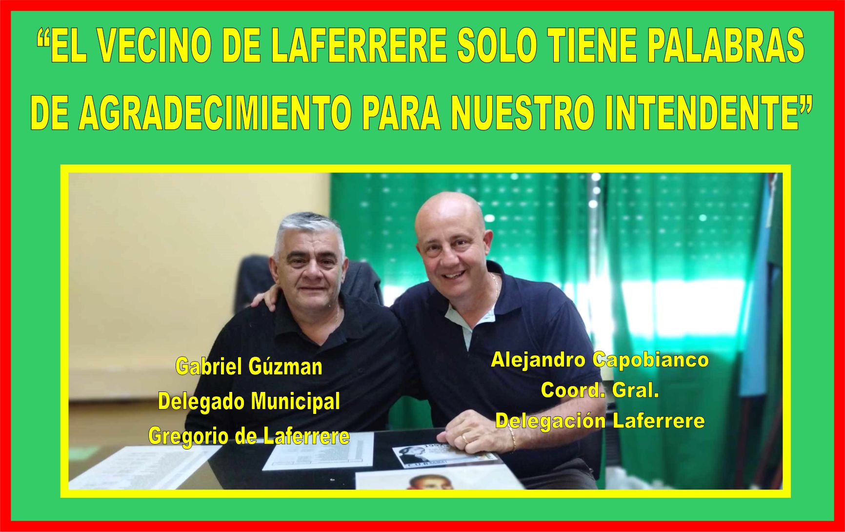 AC.: “La verdad me siento complacido de integrar este equipo que formo nuestro intendente, junto a Gabriel Guzmán nuestro delegado que tiene una mirada superadora, de compartir trabajo con nuestro compañero sub delegado Mario Stella que interactúa con los compañeros municipales y hace muy bien su tarea, nos apoyamos mutuamente para gestionar y que todo salga bien para el vecino y la localidad, nosotros estamos de paso y tenemos que estar preparados para dejar una delegación en orden y funcionando, cosa que creo hemos logrado entre todos, espero que nuestro intendente lo entienda así, porque pusimos todo de nuestra parte para plasmar su impronta tal cual nos encomendó hace un año y medio, hemos logrado un ida y vuelta con el vecino, que viene a la delegación nos plantea sus problemas y se va con una respuesta, como dijo el delegado esta es una delegación de puertas abiertas a la comunidad y de esa forma trabajamos por y para el vecino, y para la localidad”