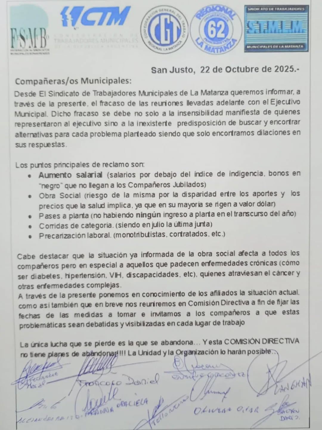 En la nota, la Comisión Directiva del STMLM se compromete a convocar a los afiliados a una asamblea para decidir el camino a seguir en este conflicto.